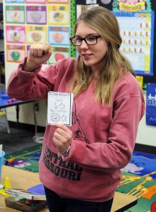 Alaina Nichols, a student teacher from the University of Central Missouri, explains the ballot to students in Tina Emery’s kindergarten class at Skyline Elementary.
