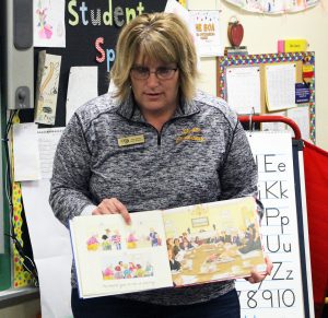 Teacher Tina Emery reads “My Teacher for President” to her kindergarten students before they cast their ballots. Emery emerged victorious over Duck in the class election.