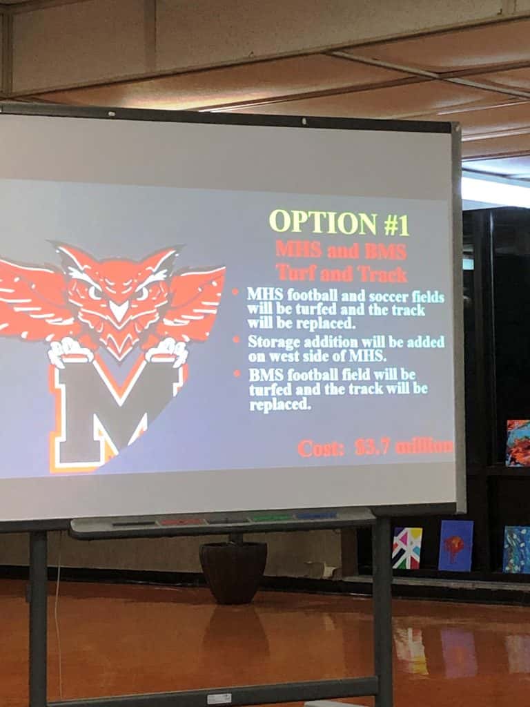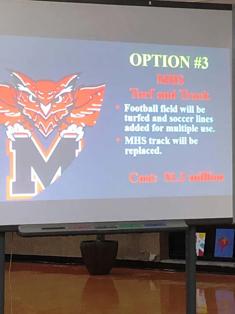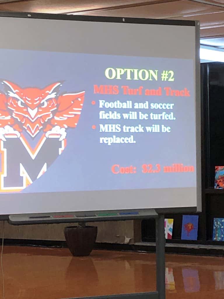 Superintendent Dr. Carol Maher, who pointed out this is not a recommendation by the administration but simply gathering three options for turfing of the football fields at the high school and perhaps at Bueker Middle School and other athletic additions. The options range in estimated cost from $3.7 million for Option 1; to $2.3 million for Option 2; and to $1.3 million for Option 3.