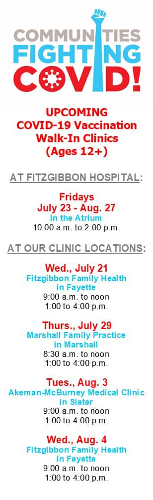 Health officials say getting vaccinated is crucial. Fitzgibbon Hospital and affiliated clinics have scheduled vaccine clinics at various locations, available to persons age 12 and older.