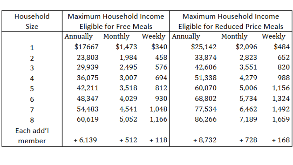 Children from families whose current income is at or below those shown are eligible for free or reduced price meals. Applications are available at the school office. To apply, fill out a Free and Reduced Price School Meals Family Application and return it to the school. The information provided on the application is confidential and will be used only for the purpose of determining eligibility. Applications may be submitted any time during the school year. A complete application is required as a condition of eligibility.