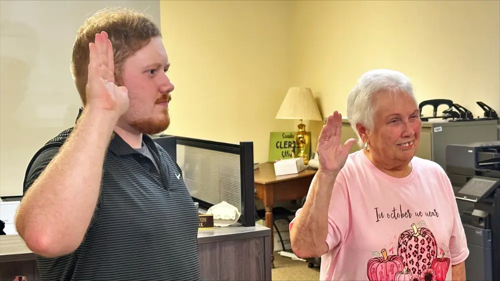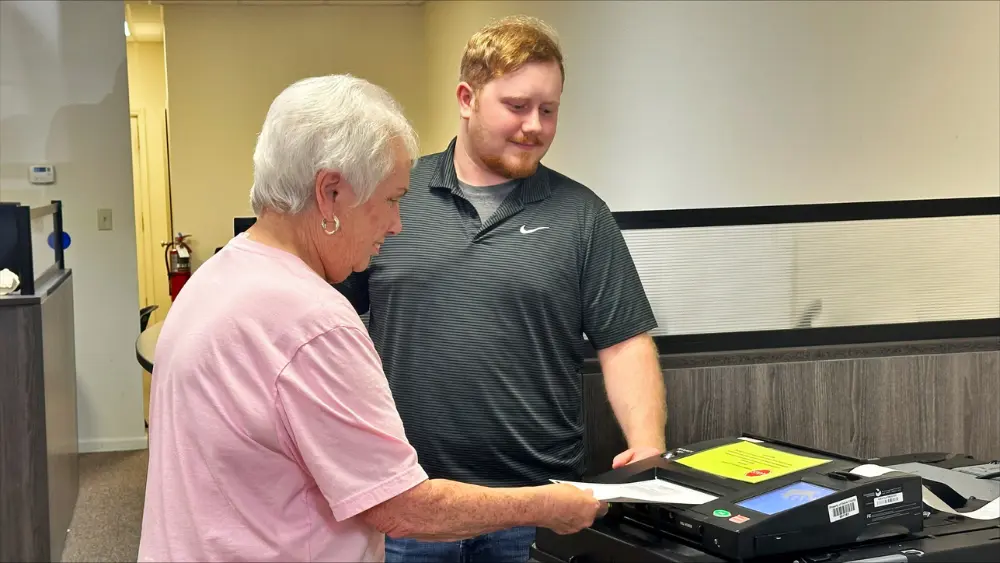Election judges Pam LaFrenz and Gunner Ussery were sworn in by county clerk Brittni Burton prior to feeding the three test ballots. Burton tells KMMO News that as of early this (Thursday) afternoon, four absentee ballots have been cast, while another three mail-in ballots have been received.