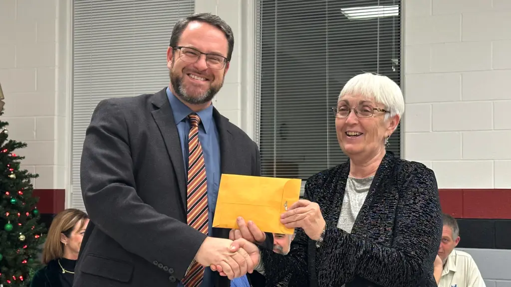 Marshall Schools Supt. Caleb Petet presents donations from the district’s staff to Mary Ann Gilpin of the United Way of Saline County, during the Dec. 9, 2025 Marshall Board of Education meeting. (Photo by Kyle Hill, KMMO News)