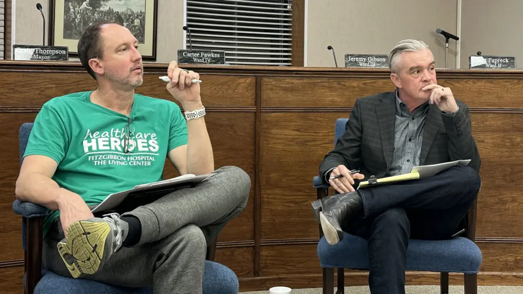First ward councilman Drew Green (left) and city administrator JD Kehrman (photo by Kyle Hill, KMMO News)