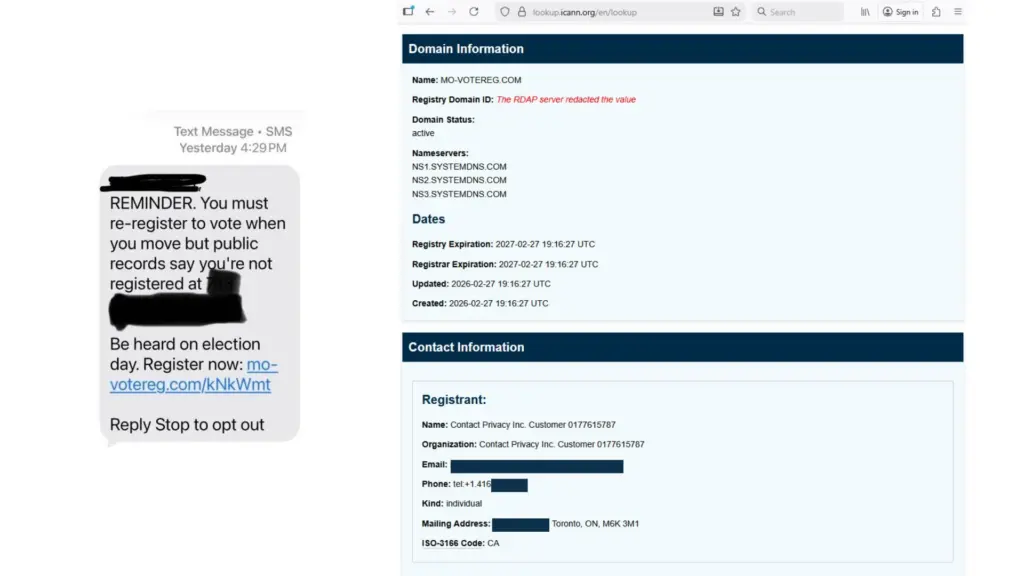 In a screenshot made public March 4, 2026 by Saline County Clerk Brittni Burton, a text message recently received by a voter suggests that their registration was out of date, and that they needed to visit the linked website. A WHOIS domain lookup, conducted by KMMO News the morning of March 5, shows that the domain was registered Feb. 27, 2026 through a privacy protection firm based in Canada.