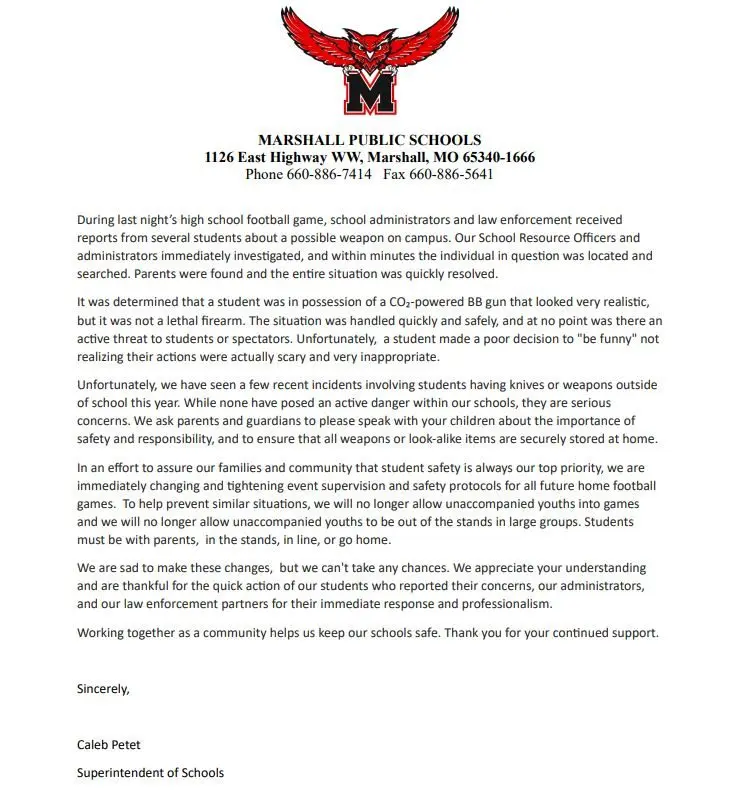 According to Petet’s statement, school administrators and law enforcement received reports from several students about a possible weapon on campus. After an investigation, it was determined that a student was in possession of a CO2 powered BB gun that looked realistic. The district stresses that there was no active threat to students or spectators.